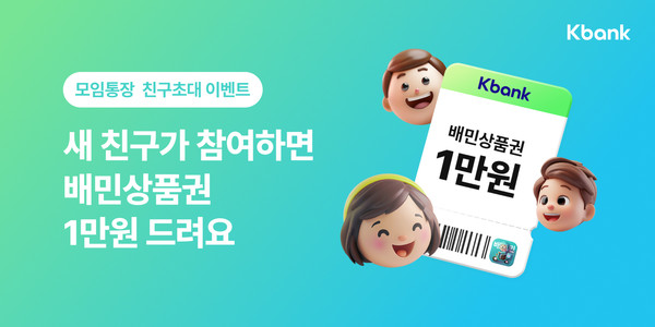 ‘모임장 이벤트’는 케이뱅크 고객이 모임통장을 만들고 새로운 신규고객이 모임원으로 가입하면 모임장에게 배달의민족 1만원권을 제공한다. 신규고객 1명당 1개를 지급하며 초대한 인원수만큼 상품권을 지급한다. 준비한 상품권 1만개가 소진되면 모임장 이벤트는 자동 종료된다.