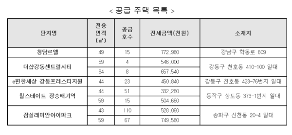 이번에 공급하는 293세대는 모두 신규 입주 단지(서울시 재건축·재개발 매입형)로, 강남구 ‘청담르엘,’ 강동구 ‘더샵 강동 센트럴시티,’ ‘e편한세상 강동 프레스티지원,’ 동작구 ‘힐스테이트 장승배기역,’ 송파구 ‘잠실 래미안 아이파크’ 등 4개 자치구 소재 5개 단지다.